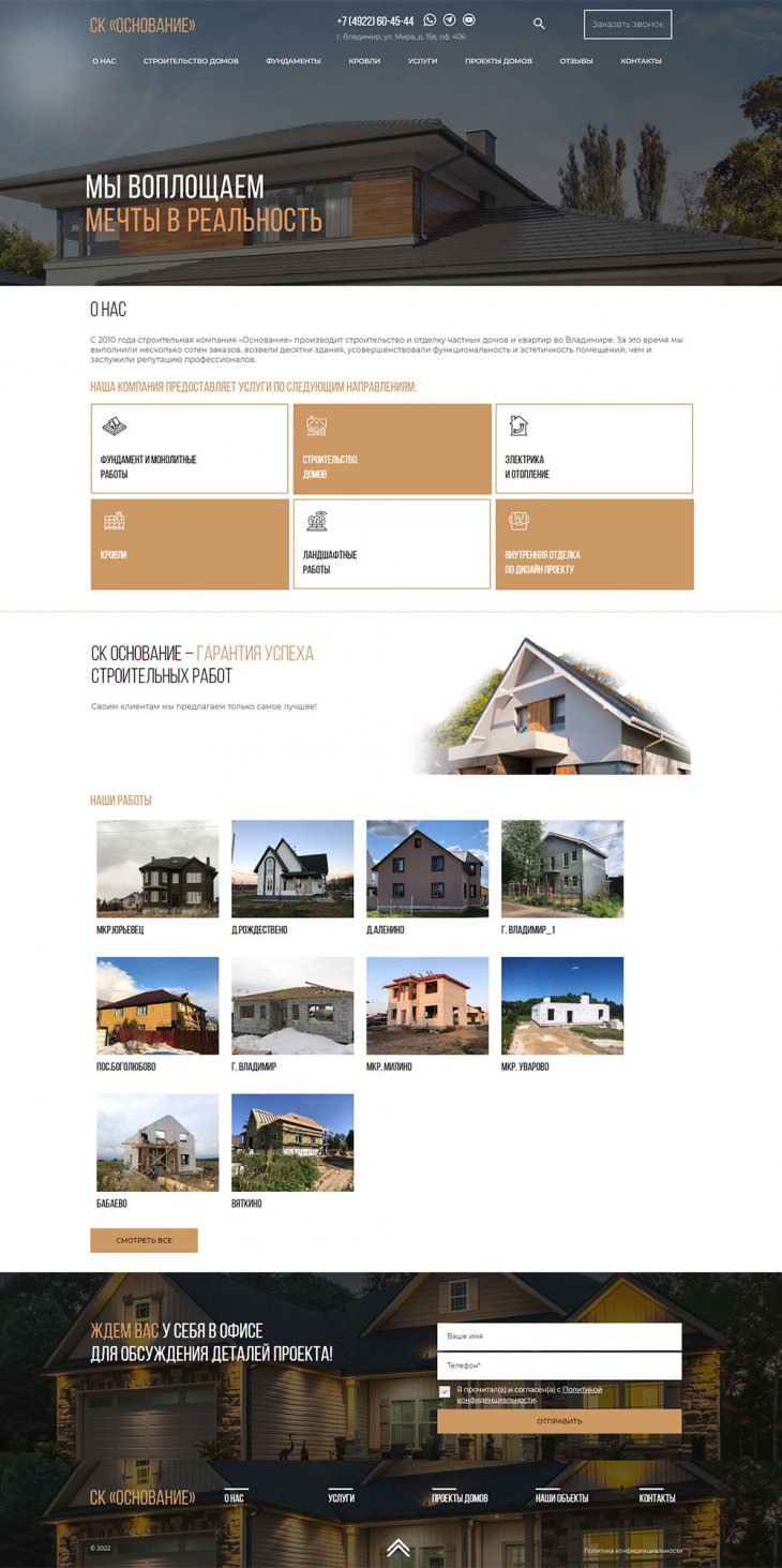 С 2010 года строительная компания «Основание» производит строительство и отделку частных домов и квартир во Владимире. За это время мы выполнили несколько сотен заказов, возвели десятки здания, усовершенствовали функциональность и эстетичность помещений, чем и заслужили репутацию профессионалов.