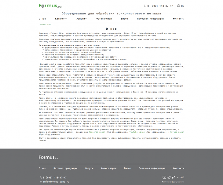 Компания «Formus-line» заключается в предоставлении консалтинговых услуг, результатом которых является: заключение контракта на поставку оборудования, его изготовление, поставка и запуск в производство.Компания «Formus-line» заключается в предоставлении консалтинговых услуг, результатом которых является: заключение контракта на поставку оборудования, его изготовление, поставка и запуск в производство.
